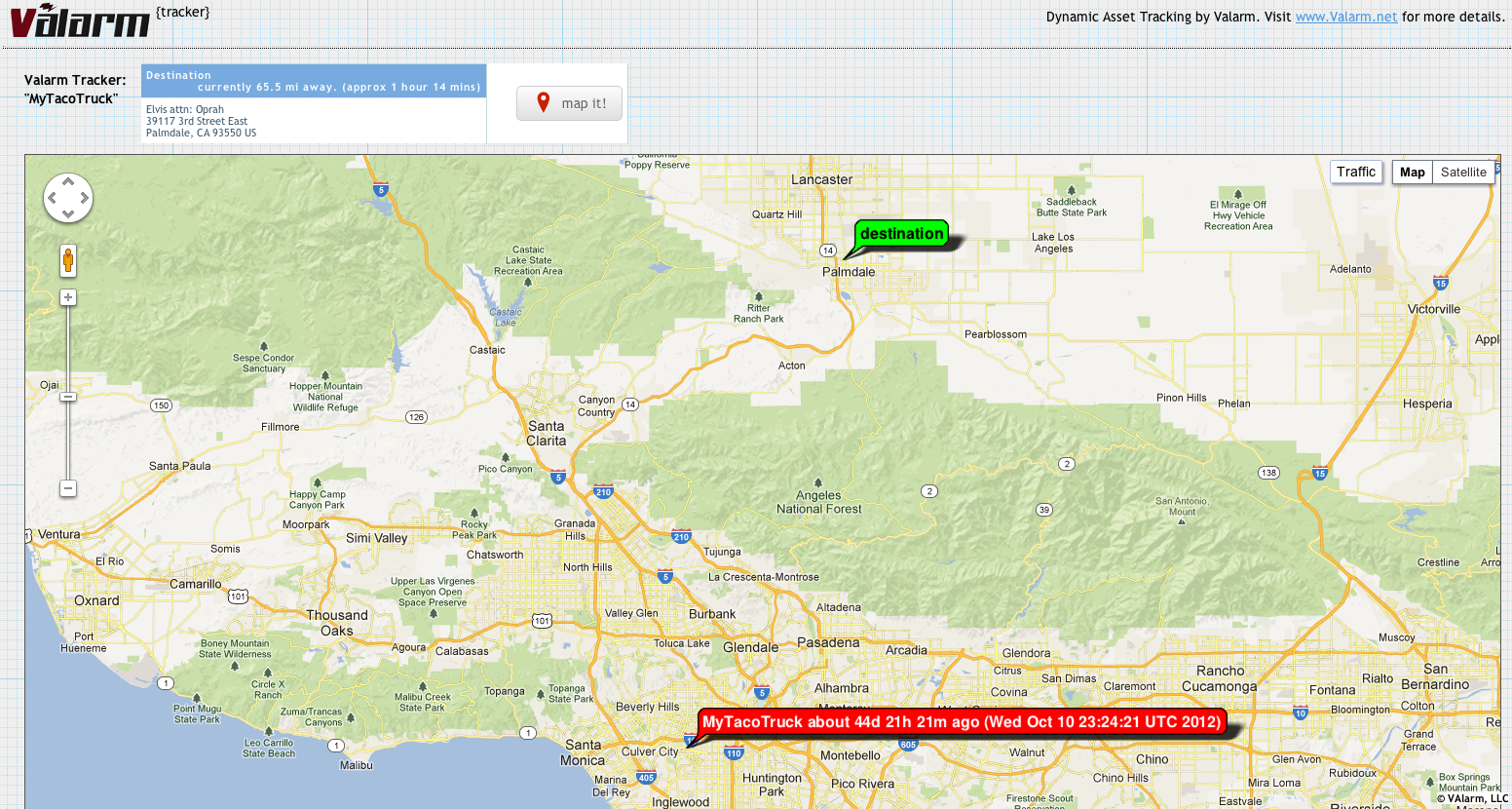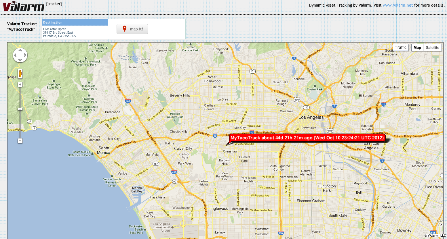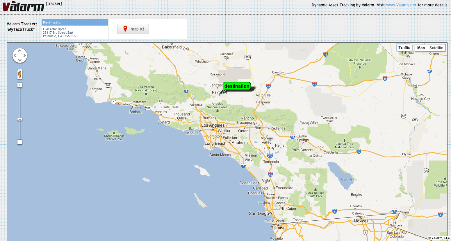 Valarm’s Public Tracking feature allows you to track anything in real-time and share it publicly. Perhaps you have the town’s most delicious tacos in your taco trucks and want people to know the location where the tacos are selling every day. If you’re late or early or have a sudden last minute change of location your customers will still be able to find you! Or if you deliver other food, goods, lumber, or anything else, your customers want to know when your product will arrive. With Valarm Public Tracking you can give your customers a web address where they see exactly where their package is in real-time so they really know when it’s going to get there instead of “this afternoon”.