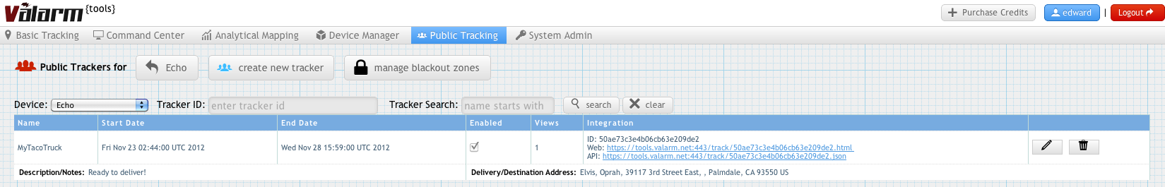 4. Now our newly created taco truck public tracker shows up in the public tracker list! If you have Valarm Pro Tools (contact us at info@valarm.net for more info) you get access to the Public Tracker API and you will also be able to set up blackout zones. Blackout zones are customized areas where your Valarm device tracker is not visible. You may want to use this if you have a depot or headquarters for your taco trucks, limousines, anything else valuable and you don’t want your location to be visible in that zone. You will see more details on blackout zones in part 7. of this page!